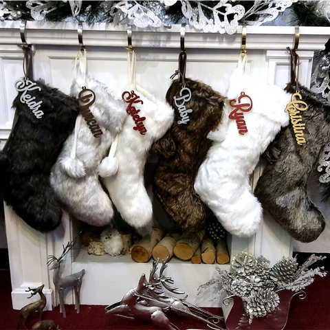 Tùy Chỉnh Xmas Trang Trí Nội Thất Cá Nhân Poms Poms Faux Lông Giáng Sinh Vớ Với Cutout Gỗ Tên Tag